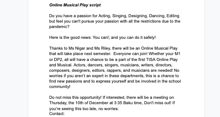 Celine Esper: “My goal is to create promotional videos to advertise clubs and after school activities at TISA to therefore inform students about the clubs and hopefully increase the number of students joining while I improve and develop my video editing skills. Video editing is one of my passions so this is a reason why I am doing this project, to improve my editing skills meanwhile benefiting the TISA community. This links to my global context really well: Personal and Cultural Expression.”
